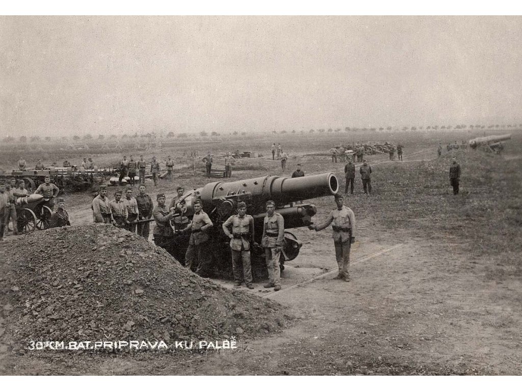 Těžké moždíře ráže 30,5 cm Škoda vz.16 v Milovicích. Maximální dostřel této zbraně střelou o hmotnosti 380 kilogramů byl 12,3 km. Obsluha moždíře dokázala vypálit až 20 ran za hodinu.