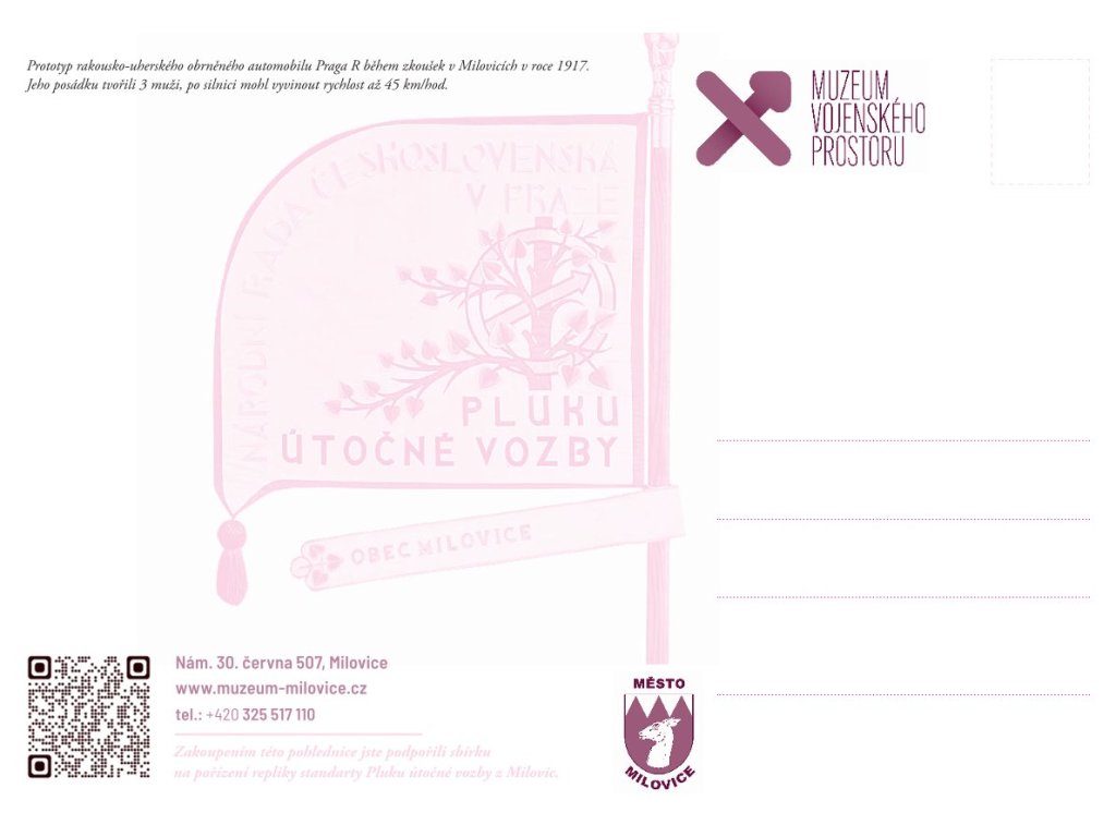 Zakoupením této pohlednice jste podpořili sbírku na pořízení repliky standarty Pluku útočné vozby z Milovic.